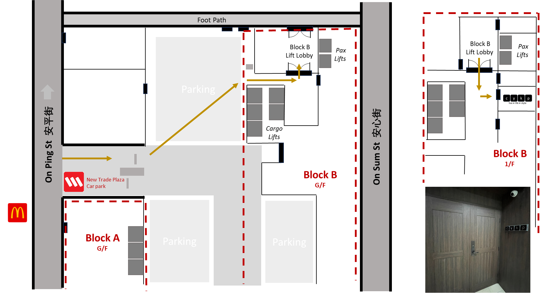 Note: Outside of office hours (such as 7pm on weekdays), the entrance to the Block B lobby from the “foot path” is closed, you will need to enter from the car park on On Ping St per the instructions in the map below.