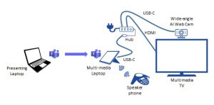 Scenario 1: Using the solution “stand alone”, that is not bringing your own laptop or device. Simply the core of the solution is the “multimedia laptop” where the conferencing software is installed and run (such as Teams, WebEx, Zoom etc), the “multimedia laptop” is connect to a “USB-C hub” by a single usb-c cable that provides power to the “multimedia laptop” and controls the various peripheral devices. The peripheral devices are: