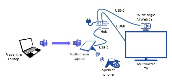 This setup we have found to be the most “seamless” and “frictionless” in hosting and running a conference meeting; where the “multimedia laptop” is a “virtual participant” to the meeting and other participants “take control” of the conference using their own devices which is been projected onto the “multimedia TV” through the “multimedia laptop”.