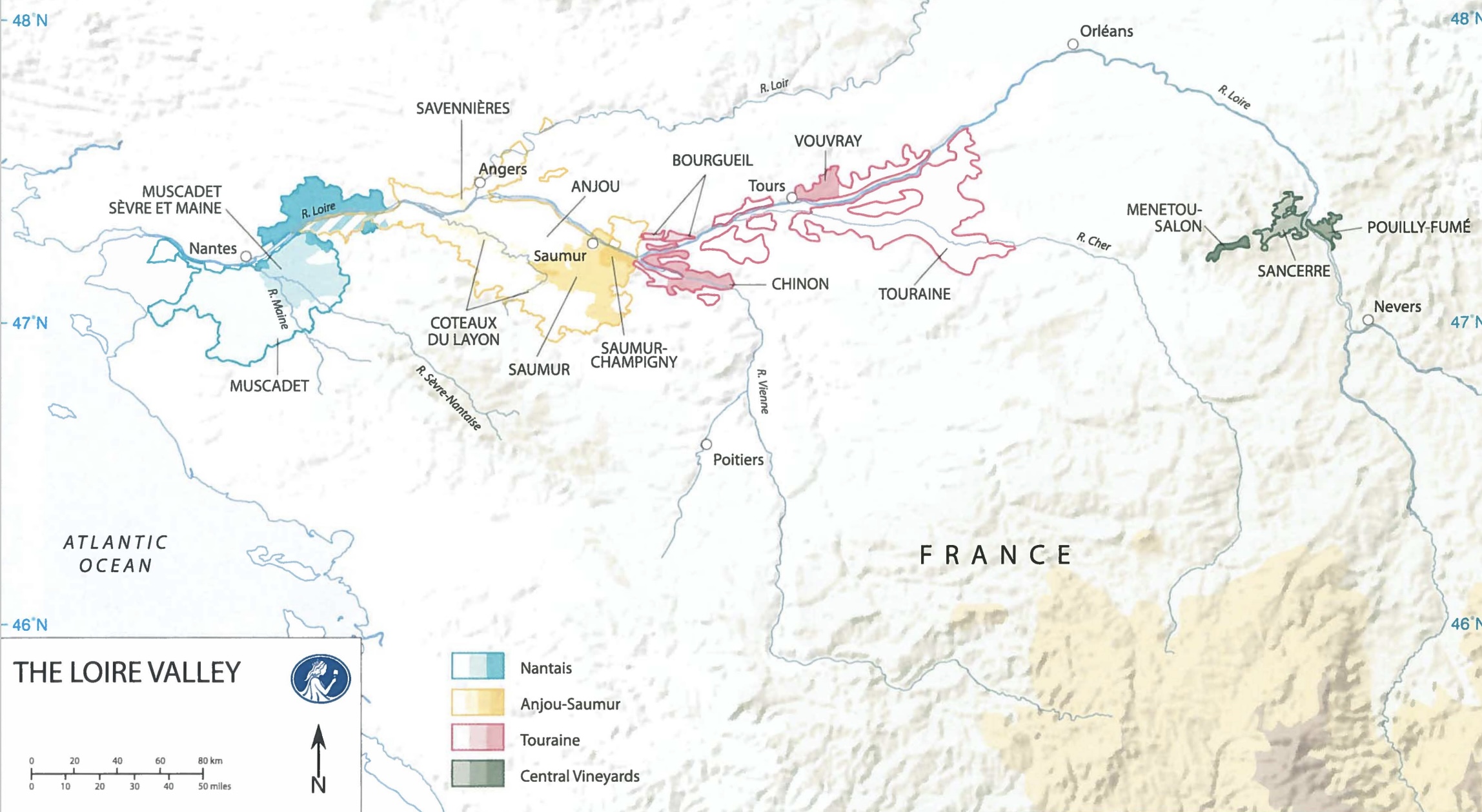 A wine region in France named after the The Loire, the longest river in France. There are four sub regions that make up the Loire Valley wine region, which itself only has an Indication Géographique Protégée (IGP) - Val de Loire; the four sub regions from west (the Atlantic Ocean) to the east (inland) are